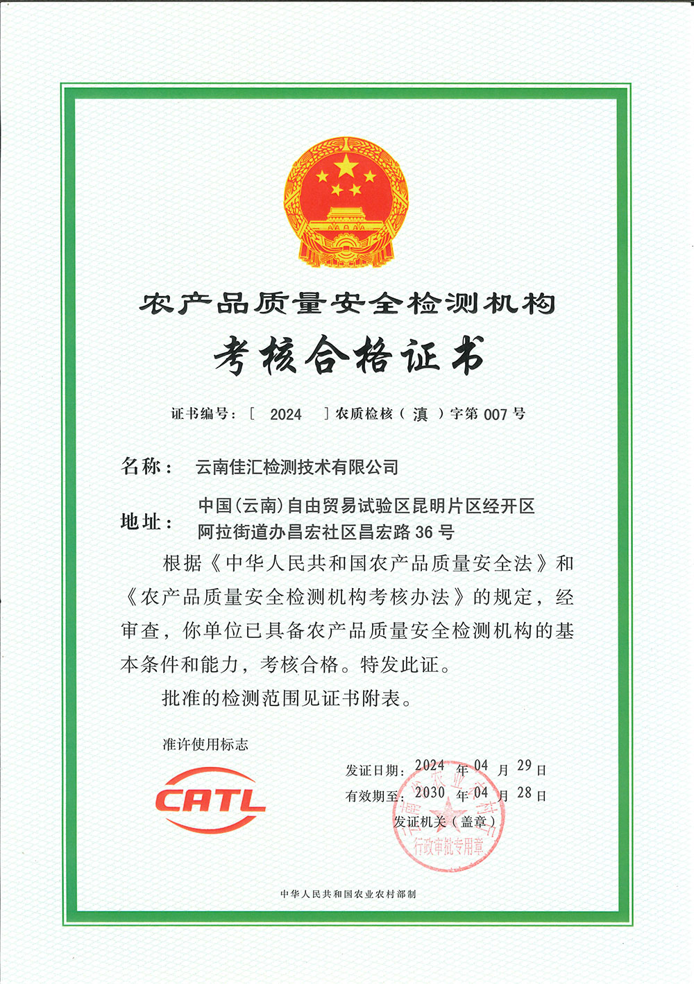 農(nóng)產(chǎn)品質(zhì)量安全檢測(cè)機(jī)構(gòu)考核合格證書